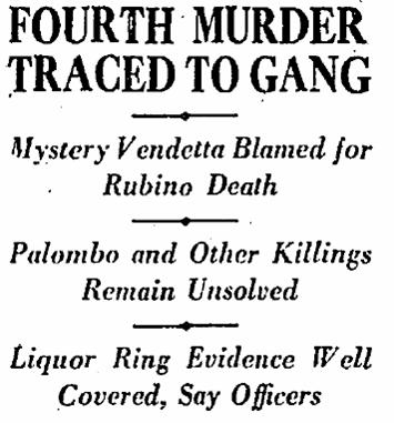 That appeared to be that. On August 25, Phillip Rubino was murdered outside his home at 6320 Holmes Avenue; he is the third victim listed by the LAPD as a gangland killing of 1928 though police at the time said they could find no connection between Rubino and bootlegging. Still, they believed he was killed by the same person responsible for the deaths of Cassity, Lafferty/Rosen and Palumbo.