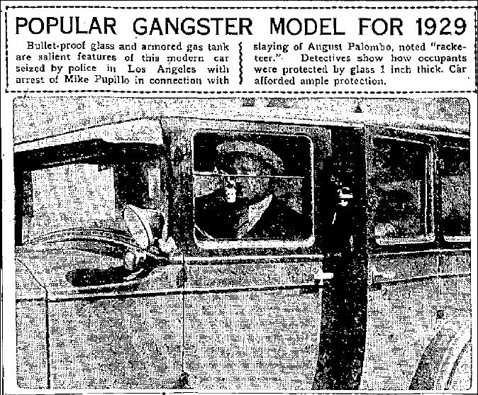 The auto was noteworthy for some interesting customizations, the likes of which had not been seen in Los Angeles before: it was equipped with bullet-proof glass and armored plating covering the gas tank and body. Captain of Detectives Bean believed the car, co-owned by Pupillo and Ardito, was one in which several Chicago gangsters had been “taken for a ride” and that Eastern gangsters were now attempting to “organize” liquor in L.A.