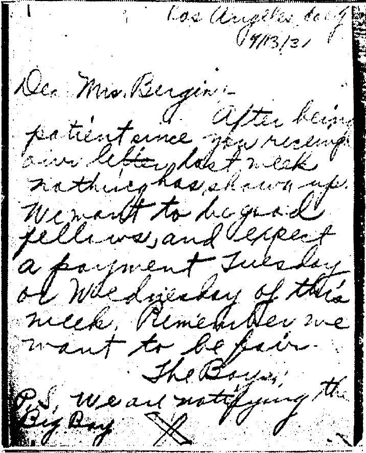 A few weeks after returning to Los Angeles, Bergin began receiving phone calls demanding money. He was stopped on the street by a stranger, who threatened him if he refused to pay up. Another time his automobile, driven by chauffeur Eugene Boyd, was forced to the curb by men in another auto. At the point of a gun, Bergin wrote out a check. The extortionists continued to make threats, however, often arranging to meet on lonely stretches of highway, where, under duress, Bergin wrote out more checks. Eventually they totaled $7,000.