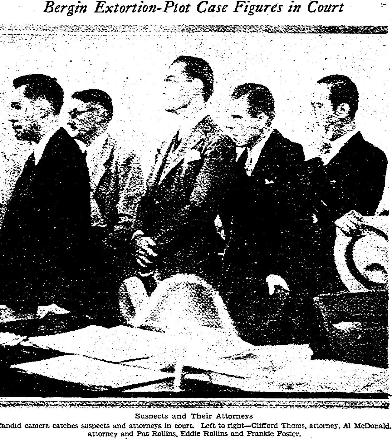 L-R: attorney Clifford Thomas, attorney Al McDonald, Pat Rollins, Eddie Rollins, and Frankie Foster in court for the Bergin extortion case. LAT 9-25-1931.