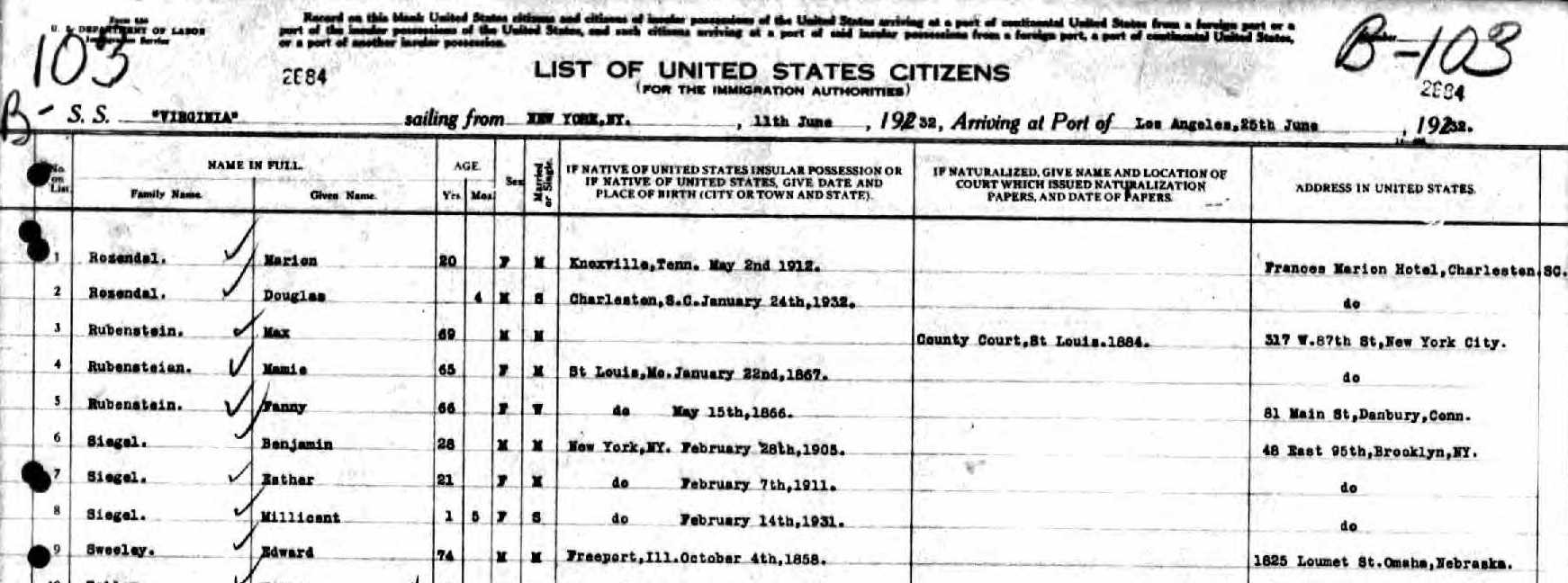 Benjamin Siegel (misspelled here as Sagel) arrived in Los Angeles from New York aboard the Grace Line’s S.S. Santa Rosa on May 24, 1936. His home address was officially 190 Old Army Rd., Scarsdale, NY.