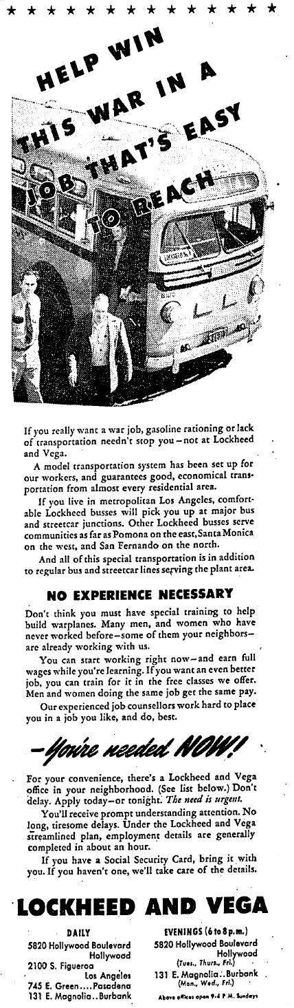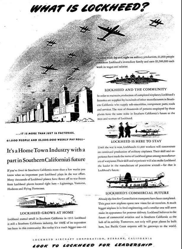 In late 1940 Union Air Terminal became Lockheed Air Terminal. Lockheed and Vega also had defense plants located here, building airplanes for the war effort.