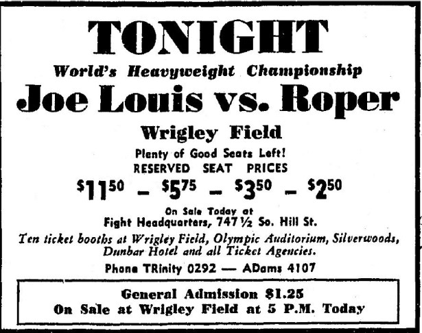 In April 1939, Los Angeles got to see Joe Louis in action live, when he defended his title against Jack Roper at Wrigley Field. Louis won by KO in the first round.
