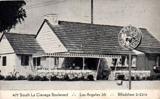 Tail o’ the Cock restaurant, seen here in 1945, was located near the oil well on La Cienega’s noted “Restaurant Row.” The round neon sign can be seen in the top image, right.