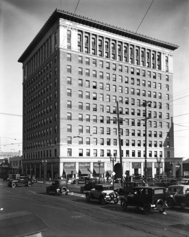 The gala grand opening of the Taft Building, designed by Walker & Eisen, and its ground-floor corner drugstore, (originally a Kress-no relation to the 5&10 chain- later Liggett’s, then Owl-Rexall) on August 20, 1924 with a battery of searchlights and Hollywood screen stars in attendance, some of them manning the drugstore counters. Vera Reynolds set the high-speed elevators in motion for the first time.