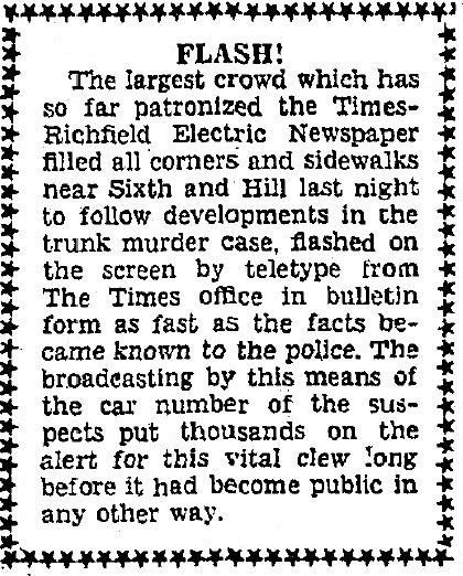 One of the biggest scoops of the newly-installed Times-Richfield Electric Newspaper was the newsflash of what would be known as the Winnie Ruth Judd trunk murder case, when the bodies of two murdered women were found in trunks checked at the Southern Pacific passenger depot on October 19, 1931. Mrs. Judd surrendered to police here on October 23 at the Bunker Hill funeral parlor of Alvarez and Moore, 500 Court Street.