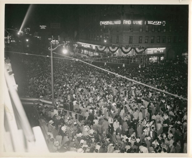 Huge crowd attend the KFWB flashcast installation ceremony at Hollywood and Vine, August 6, 1946. The temporary stage and bleachers built for the occasion can be seen here. Photo: AliceJapan
