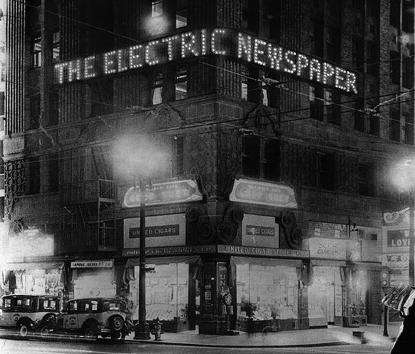 The concept wasn’t new. On October 12, 1931, the Los Angeles Times had unveiled its “Times-Richfield Electric Newspaper” on the side of the Paramount Theater at the northeast corner of Sixth and Hill downtown, which they said was the first of its kind in the Western Hemisphere (the New York Times had used an earlier version of the idea, consisting of steel-framed letters illuminated by lightbulbs in the frame that had to be changed by hand, like a theater marquee). In the Times-Richfield version, multiple banks of stationary lights formed the letters by the automated lighting of selected bulbs in sequence along the panel, giving the effect of a moving sentence.