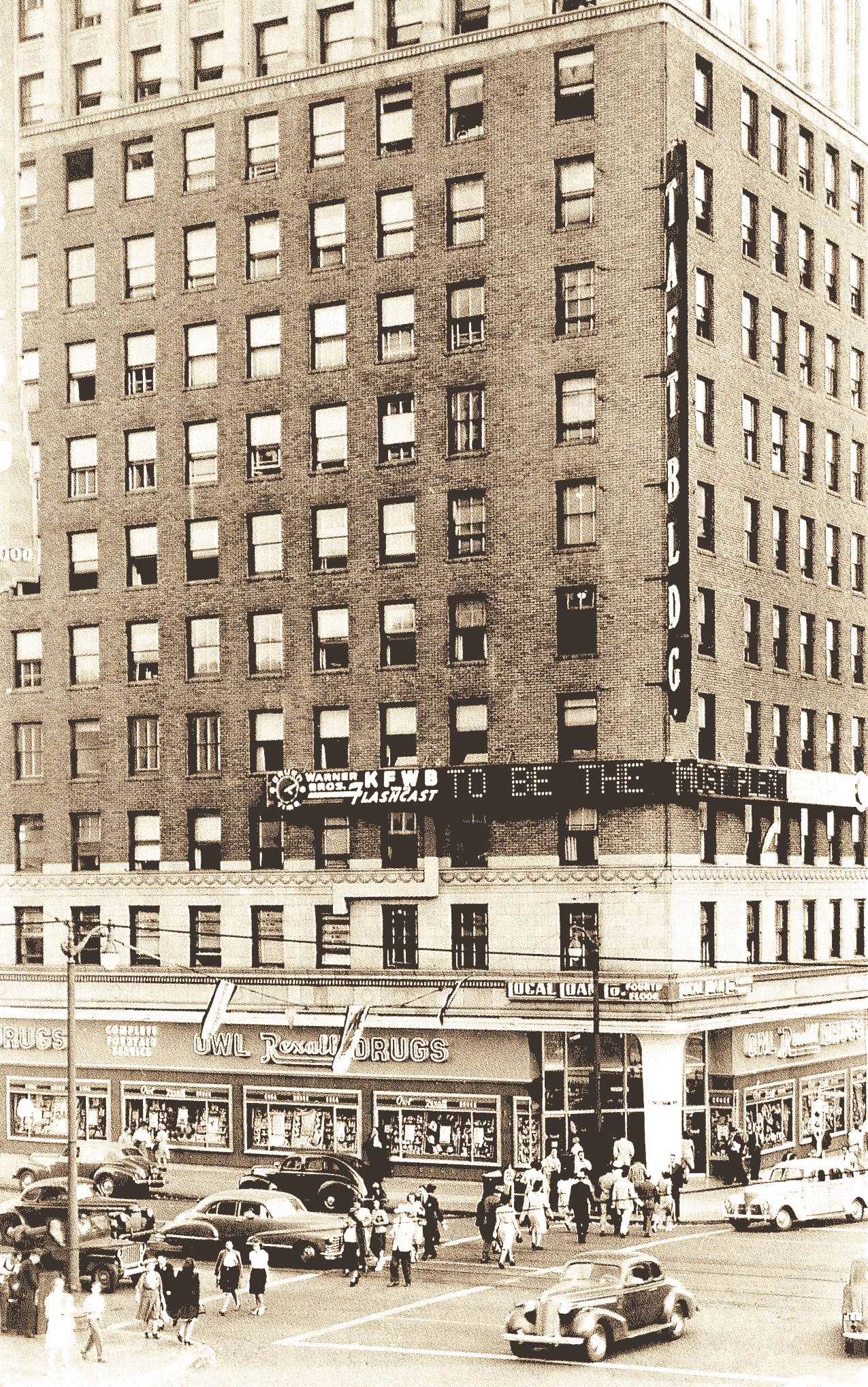 The Taft Building in Hollywood on the southeast corner of Hollywood and Vine, at 22, was the community’s oldest skyscraper. On August 6, 1946 it got a new addition to the outside of the 4th floor: KFWB’s “Flashcast” news strip, flashing out the day’s headlines in real time.