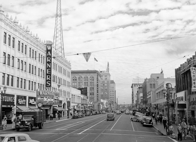 KFWB’s towers were on the roof of Warner’s Hollywood theater, seen in this January 1946 photo when it was showing The Time, The Place and the Girl. The Cole Porter biopic Night and Day with Cary Grant and Alexis Smith was screening on 8/6/46.