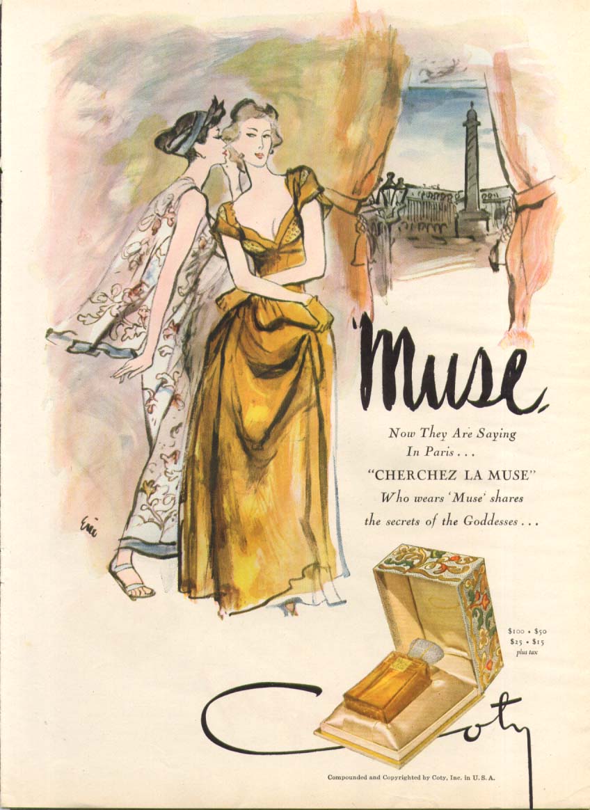 Designer Adrian, whose own salon was nearby at 233 N. Beverly Dr., in a tribute to Coty’s latest fragrance, ‘Muse’ presented nine “fabulous ‘muse’ fashions modeled by top cover girls.”