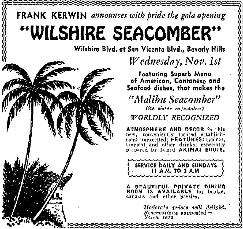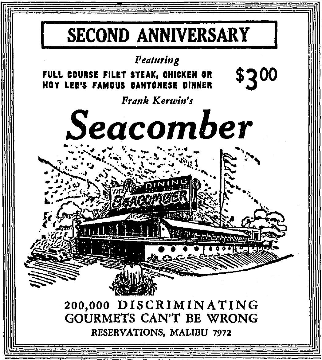 If your postwar dream was to drive to the Malibu coast and dine and dance at a seaside restaurant, Frank Kerwin could make it come true. His restaurant, The Seacomber, “America’s Tropical Showplace,” opened at 22725 Pacific Coast Highway on April 4, 1946.