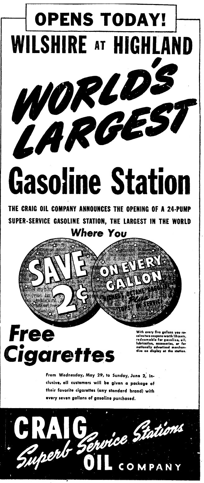 In 1946 it was good to be the world’s largest something or other. Craig Oil Company’s 24-pump super service gasoline station opened at the busy intersection of Wilshire Boulevard and Highland Avenue on May 29, 1946. Taking up an entire block, it claimed to be the largest in the world, and who knows- it might even have been true. Los Angeles, happy to be able to drive again without rationing restrictions, didn’t question it. The lucky first customers received a free pack of cigarettes with every 7 gallons purchased. In addition, the station gave away coupons with every 5 gallons worth 10 cents toward the purchase of more gas, oil, accessories or other merchandise (on display inside the station). What a deal!