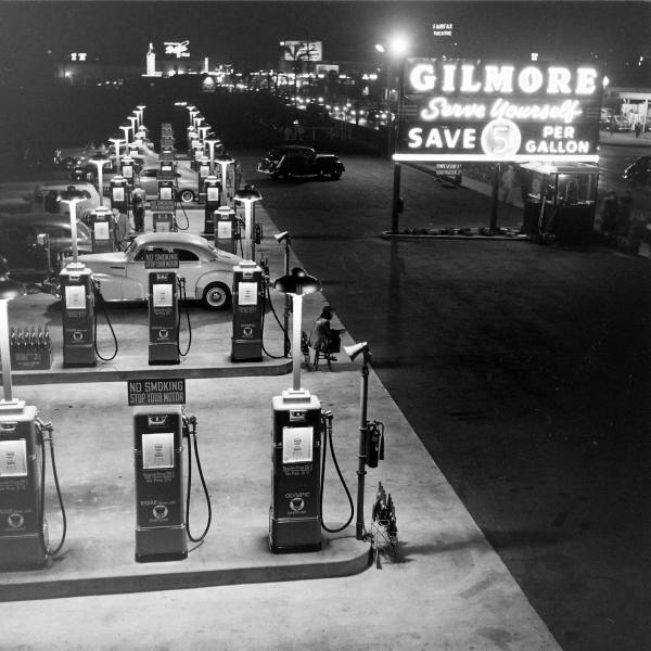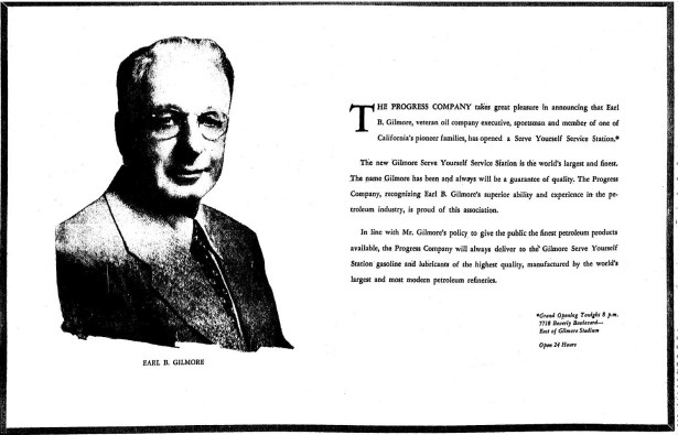 Gilmore’s Serve Yourself Gas Station, opening at 8p.m. August 11, 1948 was too late to claim the largest gas station in the world title but it could say it had the “world’s largest and most modern petroleum refineries.”