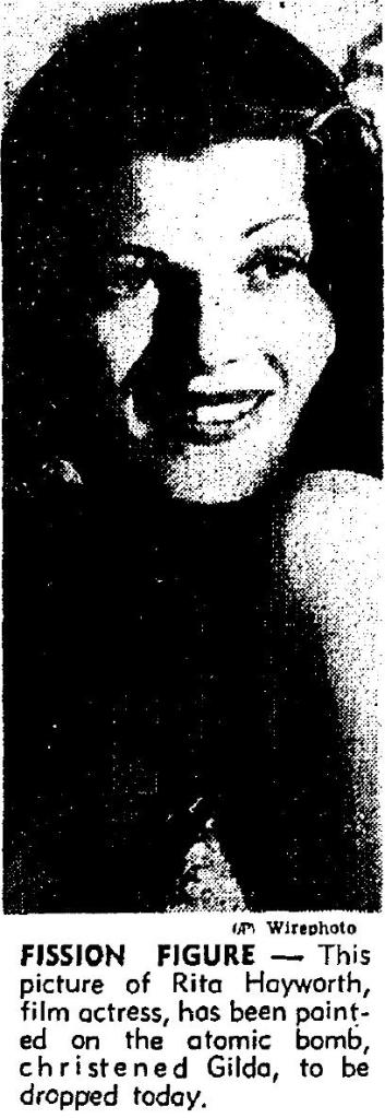 The AP reports that the first atomic test bomb to dropped would be adorned by Rita Hayworth’s image and named Gilda, for her character in the recent film of the same name.