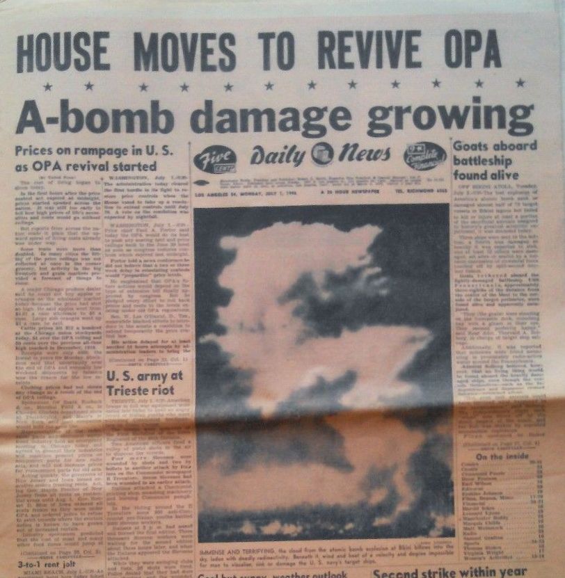 The Los Angeles Daily News front-page coverage of the A-bomb tests at Bikini atoll, 7-1-1946. On February 1, 1951, pioneering woman photographer Helen Brush Jenkins would capture the first atomic tests at Nevada from the roof of the News building.