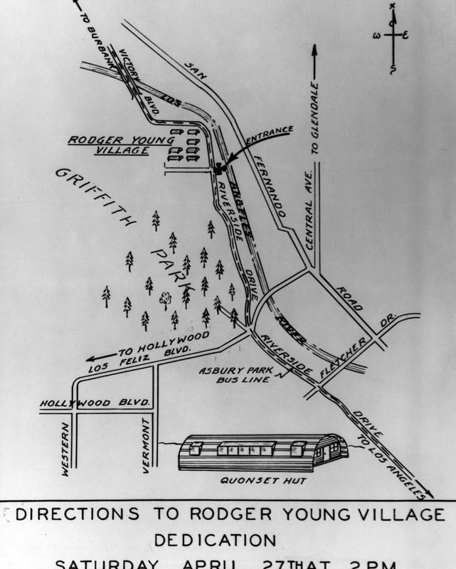 With federal, state, and local funds secured, in February the first batch of what would ultimately be 750 Quonset huts arrived at the Griffith Park site, to be named Rodger Young Village in honor of war hero Rodger Young. The huts would be converted into duplexes, for 1500 family units to house an estimated total population of 6000 residents.