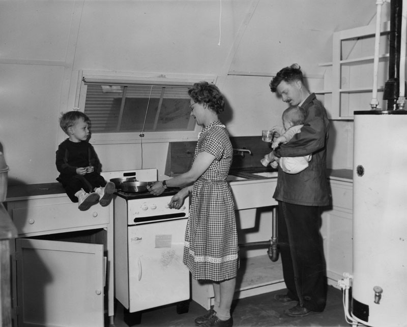 Rodger Young’s first official residents, Mr. and Mrs. Jim Parkhill, young Jim and baby Janie. The Parkhills occupied Hut 1087 until January 5, 1948 when they moved to a new home in Sun Valley.