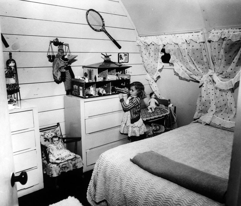 A child’s bedroom in a Rodger Young Village Quonset hut. Units came with basic furnishing, those some homemakers opted to substitute their own. The sloped walls made hanging curtains a challenge.