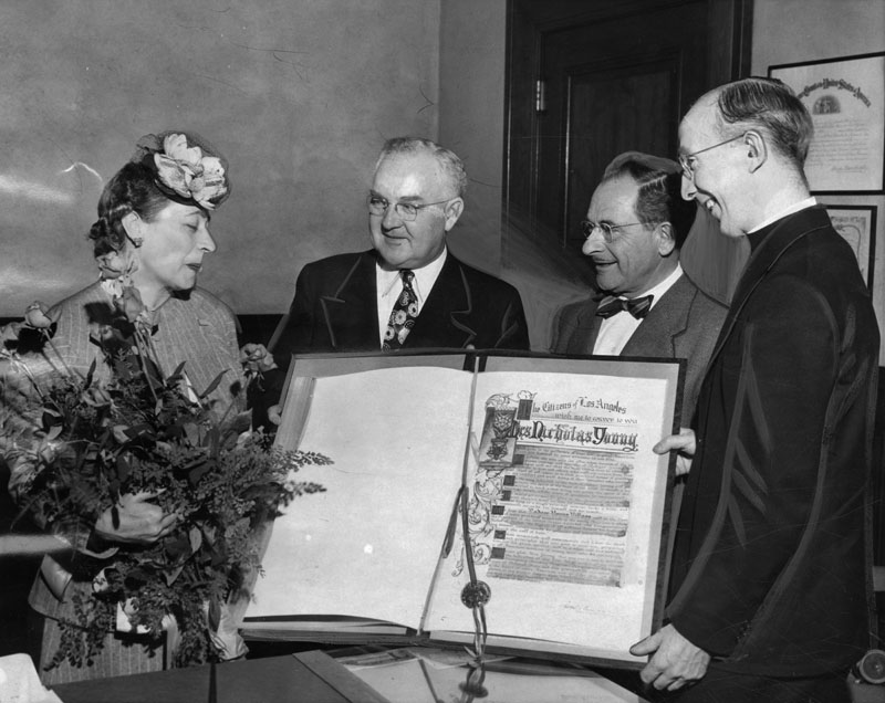 But, with work underway and the City Housing Authority besieged with applicants, construction was halted by court order on February 26. Police Commissioner Van M. Griffith filed an injunction to halt the project on the basis that the land, which the City had acquired from his father, Griffith J. Griffith was to be used in perpetuity for a park. The City did receive roughly 3000 acres for the park from the late Griffith J. Griffith. The tract on which Rodger Young Village was stand, however, was part of a 350-acre parcel that the City bought from Griffith’s estate in 1921 and had previously been used as an airport by the National Guard.