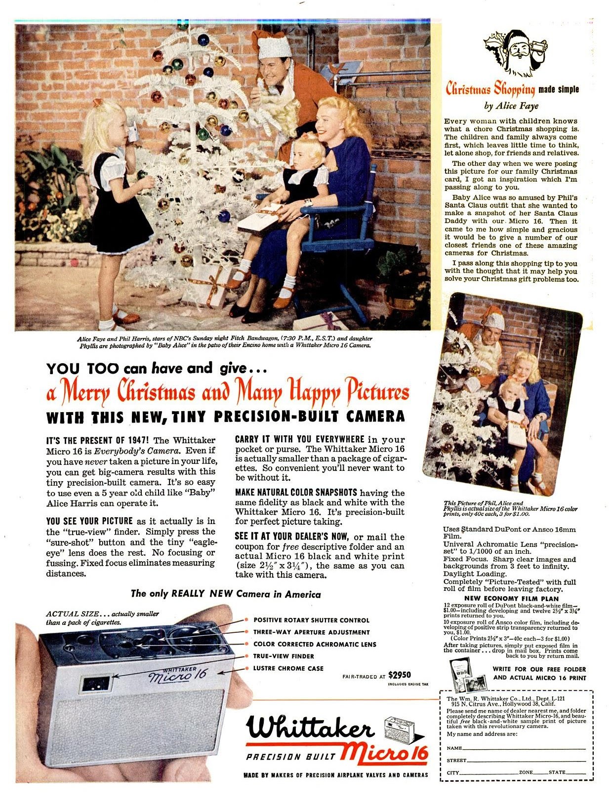 The Campus Camera Shop in Westwood Village, “the West’s largest and most complete camera store,” had its grand opening October 25, 1946. They retailed Whittaker’s Micro 16 for $29.50.