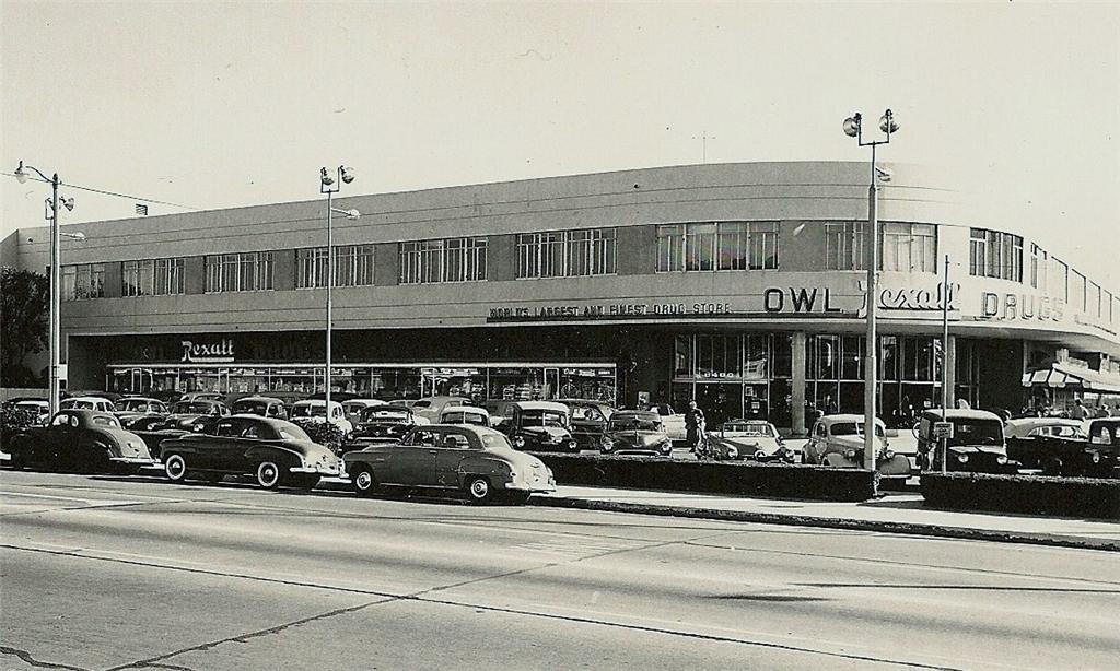 The United-Rexall headquarters and world’s largest (and finest) Owl drugstore and vicinity. Kiddie Land, with Pony rides, can be seen across the street.