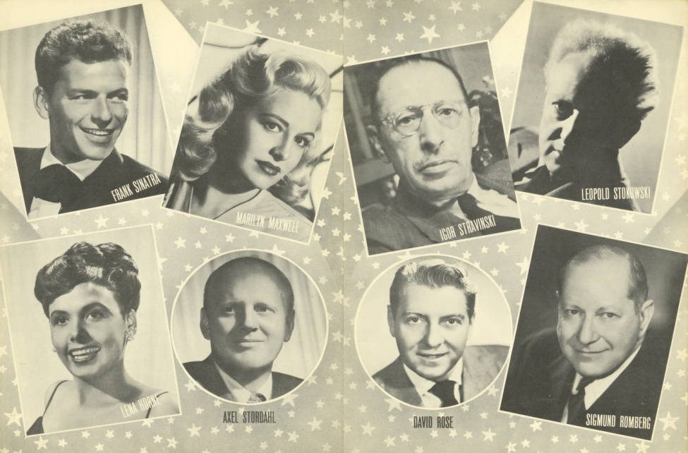 Radio announcers Ken Carpenter and Jack Haley served as masters of ceremony. Actor Robert Montgomery provided narration. Leopold Stokowsi, Igor Stravinsky and Sigmund Romberg shared orchestral duties for the classical portion of the program. Then, after an intermission, things got swinging. Accompanied by an orchestra made up of movie and radio studio musicians, there were performances by Lena Horn, Frank Sinatra, and Marilyn Maxwell.  Bob Burns appeared with his “All Star Band” (Lawrence Welk, accordion; Freddy Martin, sax; Billy Butterfield, trumpet; Charlie Barnet, sax; Carmen Cavallaro, piano; Phil Harris, drums; Harry James, trumpet). Bob Hope, Dorothy Lamour, Bing Crosby and Eddie Rio did one of their routines.  Though not in the official program, according to notes in the margin of the author’s copy, Lucille Ball and Danny Thomas also took part.