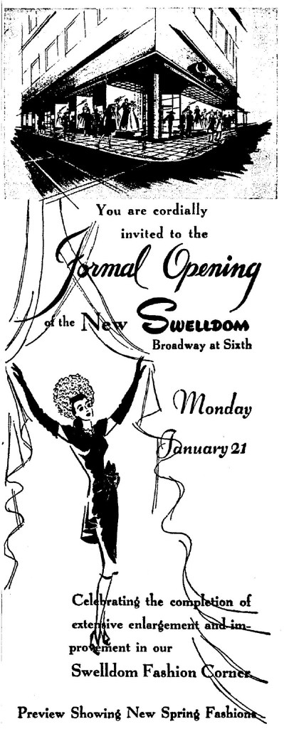 On January 21, 1946, Swelldom opened its remodeled and enlarged quarters at the Sixth and Broadway store. “The expansion of our downtown store and the opening of our Beverly Hills shop in 1943 attest the firm faith we have in the future of Los Angeles as a style center,” president Louis W. Roth told reporters.