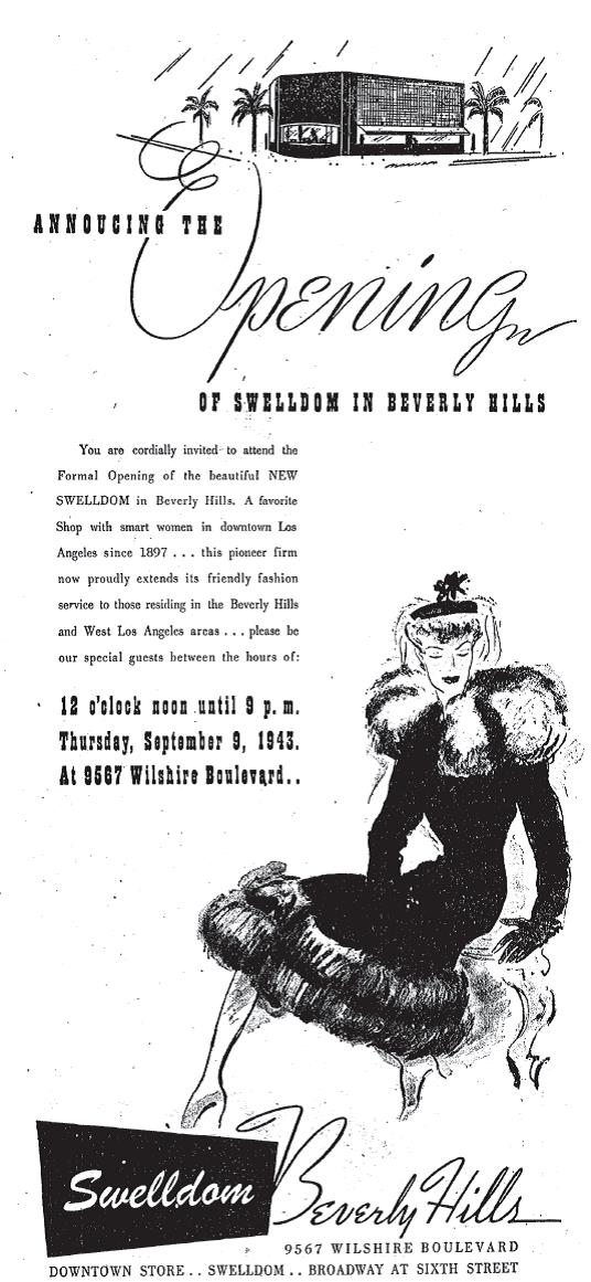 Harry Goldberg died in 1942, but Swelldom continued on, thrived even. On September 9, 1943, in the midst of World War II, a second Swelldom opened in Beverly Hills, at 9567 Wilshire.