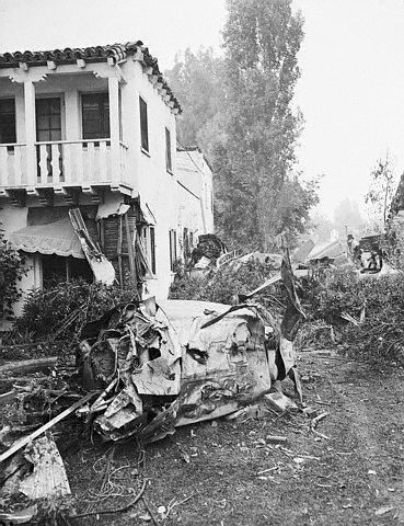An undetected leak in one of the engines had caused it to fail over Beverly Hills. Hughes appears to have tried to land the craft on the green of the Los Angeles Country Club golf course but didn’t make it. The XF-11 took the roof off the home of Dr. Jules Zimmerman at 803 N. Linden Drive, then the right wing sliced through a bedroom of 805 N. Linden, home of Jerry and Elizabeth De Kamp. It then skimmed along a row of poplar trees bounding the rear of Col. Charles Meyer’s residence 808 Whittier Dr. and crashed into the home. An engine from the plane slammed into the home of Gosta and Katherine Guston next door at 810 Whittier. The Guston’s son, Capt. James Guston, recently discharged from the Army, and Marine Sgt. William Lloyd Durkin pulled Hughes from the wreckage before it burst into flames. A broken gas main also sent flames shooting 80 feet into the air. The fire department, battled the conflagration for three hours. Fortunately no one inside the residences was killed or seriously injured. The Meyer home was almost completely destroyed. Hughes was rushed to Beverly Hills Emergency Hospital with burns and multiple critical injuries.