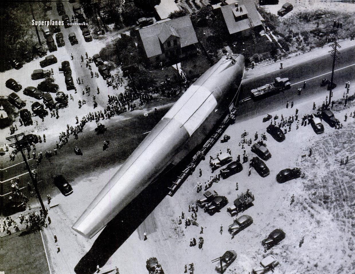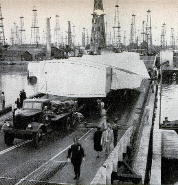 Transporting one of Hercules’ wings across the pontoon bridge to Terminal Island. The bridge opened in June 1944 to serve the naval base on the island. Popular Science, August 1946.