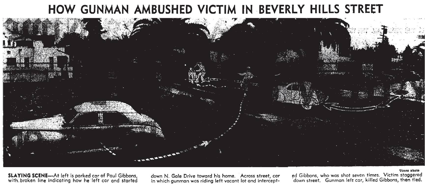 At 2:30 a.m., May 2, 1946, Gibbons was returning home, 116 N. Gale Dr., Beverly Hills, just off Wilshire Blvd. He parked his “expensive sedan” and was crossing the street when gunmen in a car intercepted him, pumping 5 shots into the little bookmaker.