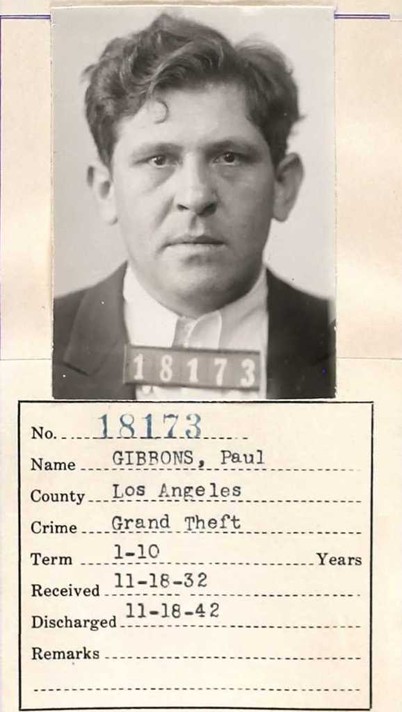 Using at least two aliases, Joe Miller and Eddie Hainer, Gibbons continued down the crooked path. It finally caught up with him in November 1932 when he was found guilty of grand theft. This time, neither his youth nor empty promises to reform could save him. Gibbons got 1-to-10 years in the state pen.