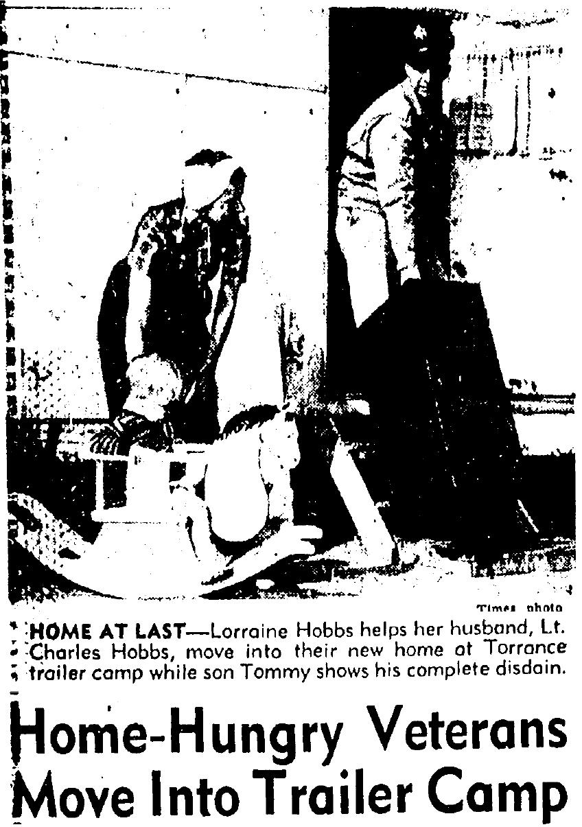 Charles Hobbs, an Army Air Force veteran, moves his family into a Lumina Park trailer in Torrance. November 1945. Rent was $24 a month.
