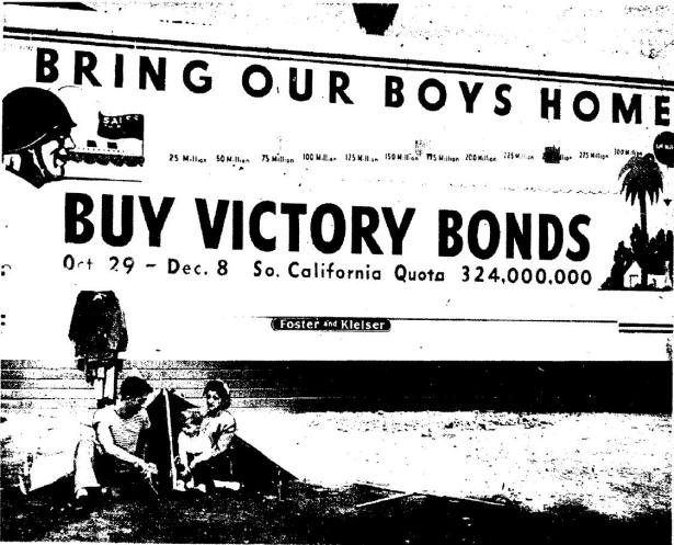 Photo of the Mizrahi family camped out in Pershing Square under a Buy War Bonds billboard, ironically touting the number of returned war veterans. 11/2/1945.