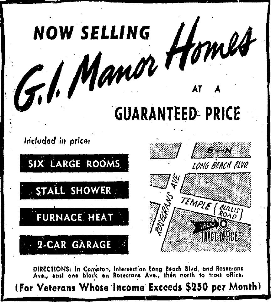 If you were a veteran with an income of $250 a month or more you might qualify for a G.I. Manor Home in Compton, available at a “guaranteed price” which is cleverly not mentioned. 10/27/1946.