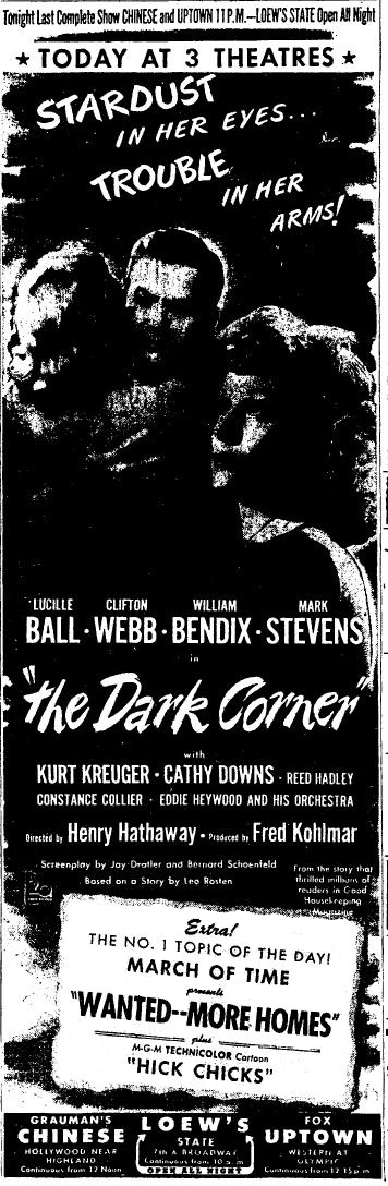“The Number 1 Topic of the Day!” Wanted: More Homes debuted in Los Angeles area theaters in May 1946, playing with the film noir The Dark Corner.