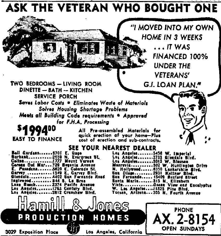 “Ask the Veteran Who Bought One.” Prefab construction was another option like this one from Hamill & Jones Production Homes. 5/5/1946.
