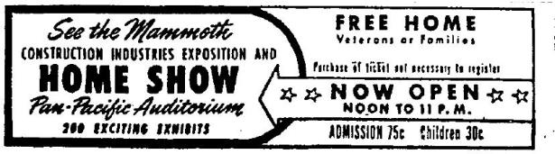 The Construction Industries Home Show held an exhibition at the Pan Pacific Auditorium from July 12 to July 21, 1946. In all, more than 160,000 visitors would attend. The most popular exhibits were the full-scale “GI Model Homes,” a modern style and a more traditional California ranch, which were raffled off to veterans at the show’s close.