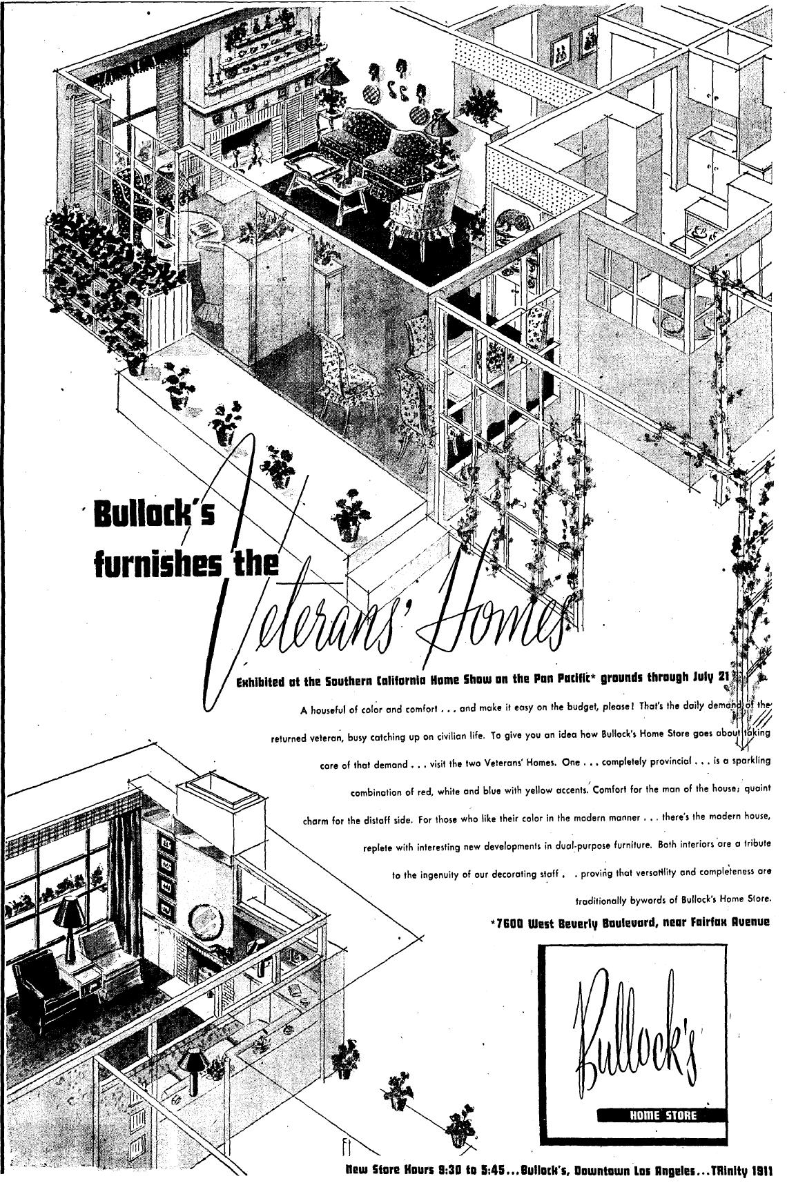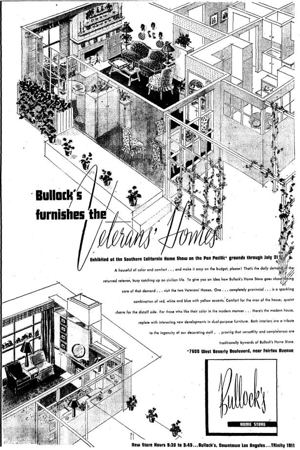 Bullock’s provided the interiors of the model GI Veteran’s Homes for the Construction Industries Home Show, just as they did the Fritz Burns Postwar House on Wilshire Boulevard and later, the “Blandings Dream House” model in Bel Air.