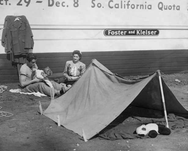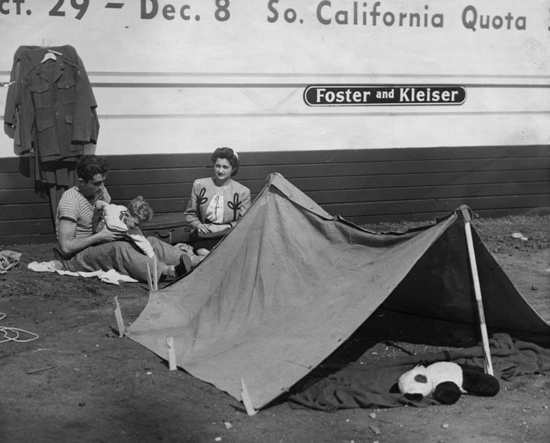 David Mizrahi, a discharged Marine, camped out in Pershing Square with his family after months of failing to find anywhere else to live. As a result, Blair McPhail, of the Tulsa-based Spartan Aircraft Co., offered the Mizrahis his suite in the swank Town House Hotel on Wilshire Boulevard. Meanwhile, Spartan, which was augmenting its plane production by manufacturing house trailers, dispatched an experimental $12,000 model for the family’s temporary use. In the resulting publicity, the family was able to secure more permanent housing after all, and the trailer went to Army veteran Francis Wood, selected from thousands of homeless vets on file with the L.A. area Veteran’s Service Center. Company president J. Paul Getty presented it to the Wood family personally.