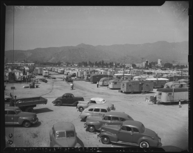 In May 1946, the War Relocation Authority sent more than 300 returning Japanese Americans to a still unfinished trailer camp at Burbank. UCLA.