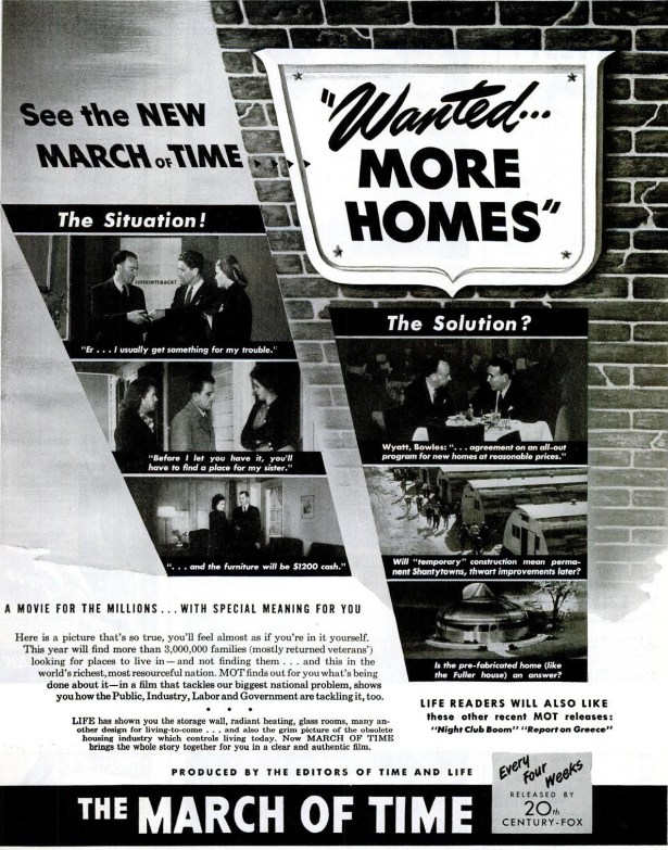 The Federal Housing Authority’s plans to provide affordable housing for returning war veterans and their families was documented in the March of Time short subject Wanted: More Homes (1946).