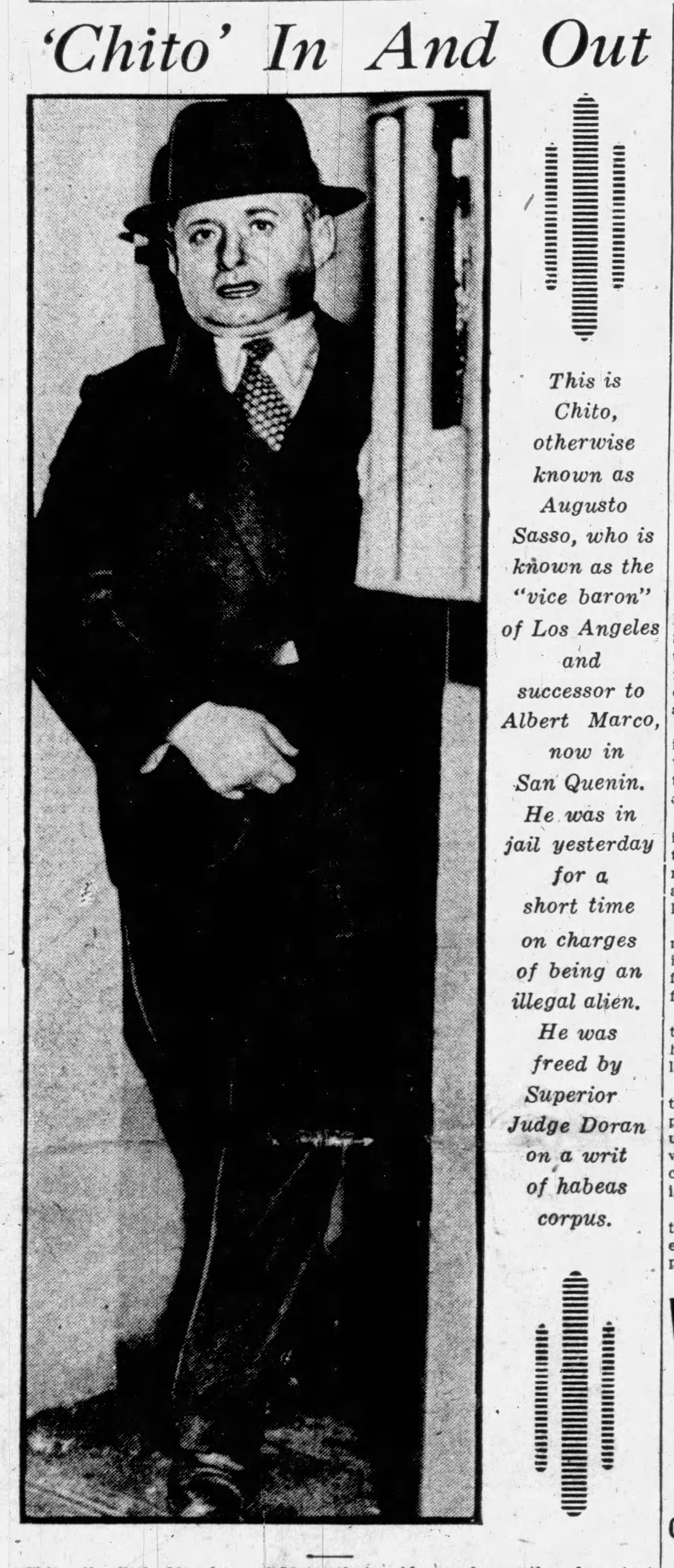 In February 1931, Sasso was arrested at his “elaborately furnished apartments” at 328-1/2 North Main Street, for being in the USA illegally- after an expose was published in the Los Angeles Los Angeles Record claiming that he entertained high ranking police and other official- even judges- at his digs. Sasso, who claimed he was “just a house painter” not a vice baron, was soon back out on the streets. Two weeks later he was arrested on a “moral turpitude” charge, and accused of running a number of “questionable houses” in the shadow of City Hall.