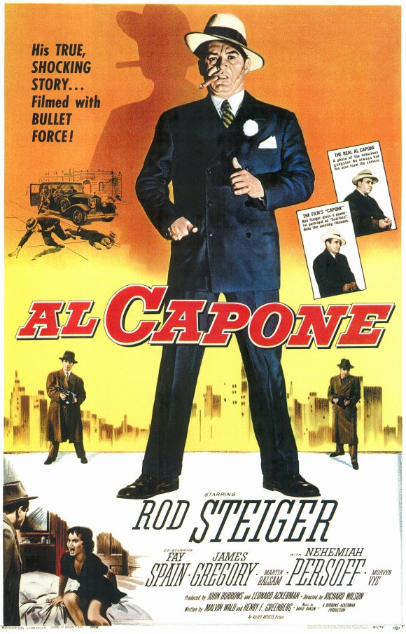 Al Capone had been dead more than a dozen years when the biopic Al Capone arrived in L.A. theaters June 17, 1959 with Rod Steiger in the title role. “He ruled America’s most roaring era! He invented the rub out and the one-way ride and organized the crime syndicate we are still fighting today!” Fellow Chicago gangster Jack McErlane might dispute the “one way ride” part, but he too was long dead.