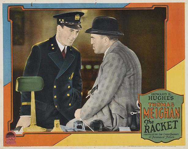 Produced by Howard Hughes and directed by Lewis Milestone, The Racket was based on Barlett Cormack’s stage play of the same name and starred Lewis Wolheim as murderous bootlegger Nick Scarsi with Thomas Meighan in the good guy role. Marie Prevost plays a canary. Reflecting back on gangster pictures just three years later, Times reviewer Philip K. Scheuer would note that while The Racket was considered “daring and revolutionary” for 1928 in its “realistic spotlight on crime,” it would be considered tame” by 1931 standards.