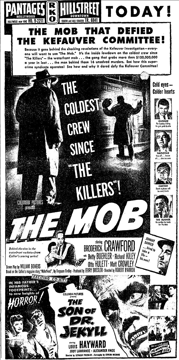 The Mob was released in October 1951, capitalizing on the televised hearing of the United States Senate Special Committee to Investigate Crime in Interstate Commerce by led by Senator Estes Kefauver