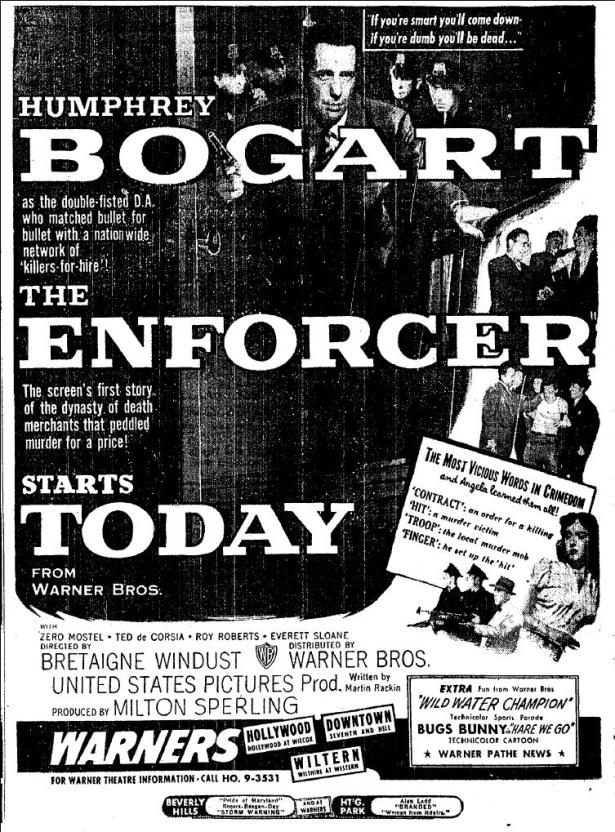 Released here in February 1951, Bogart played a crusading D.A. prosecuting a murder-for-higher crime ring not unlike Murder Inc. His key witness is unable to testify after he goes out of the window, as real life Murder Inc. hitman turned mob informant Abe Reles (“Kid Twist”) did in 1941 while in police custody. A grand jury determined in 1951, the year The Enforcer was released, that Reles fell to his death in an escape attempt.