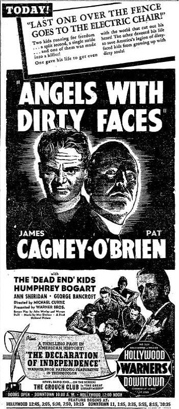 James Cagney, having been a G-man, played a gangster again in Angeles With Dirty Faces, which debuted in L.A. in November 1938. Like his earlier The Public Enemy, it was a Cain and Abel type story line of men who chose very different paths. But as Edwin Schallert noted, “While Angeles With Dirty Faces may actually be but the old gangster type of film with new trappings, it is many lifts and lofts, so to speak, above this well-worn level. Bogart made an appearance in the film as did the Dead End Kids.