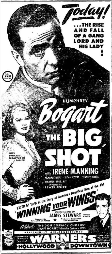 In June 1942, Bogart played “Duke” Berne, his final big screen gangster, in The Big Shot, the story of “the rise and fall of a gang lord and his lady!” (Irene Manning).